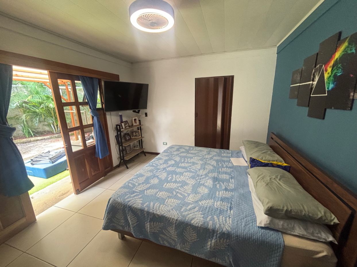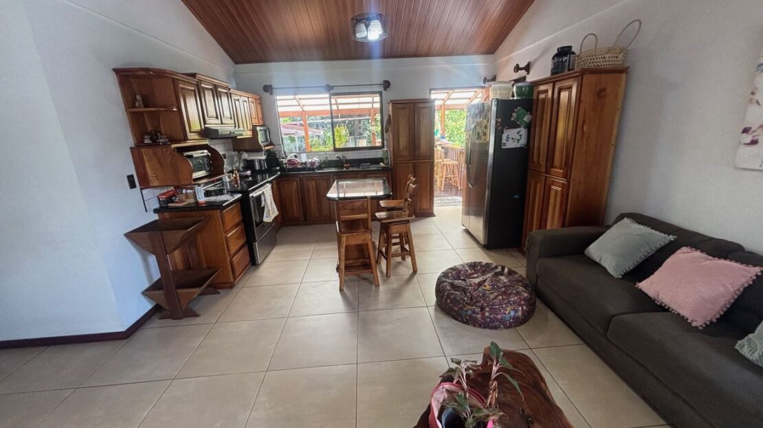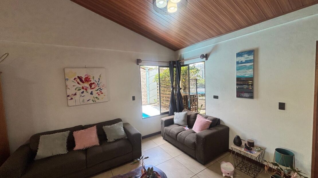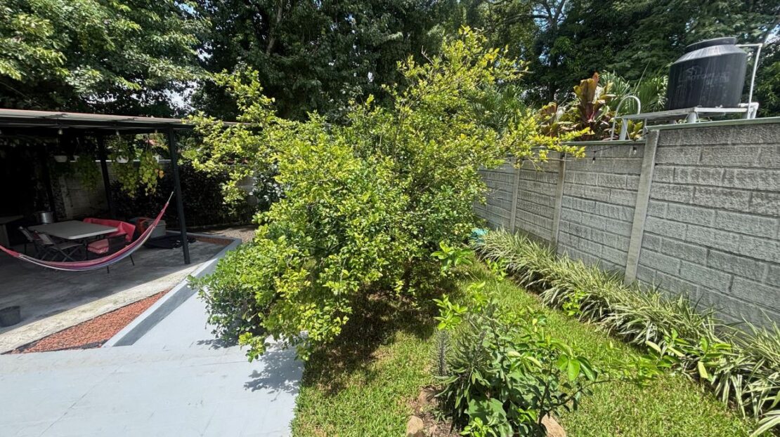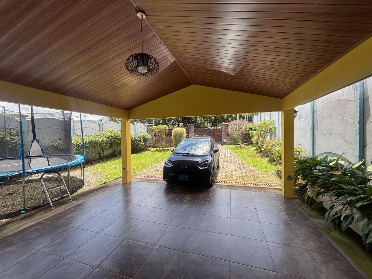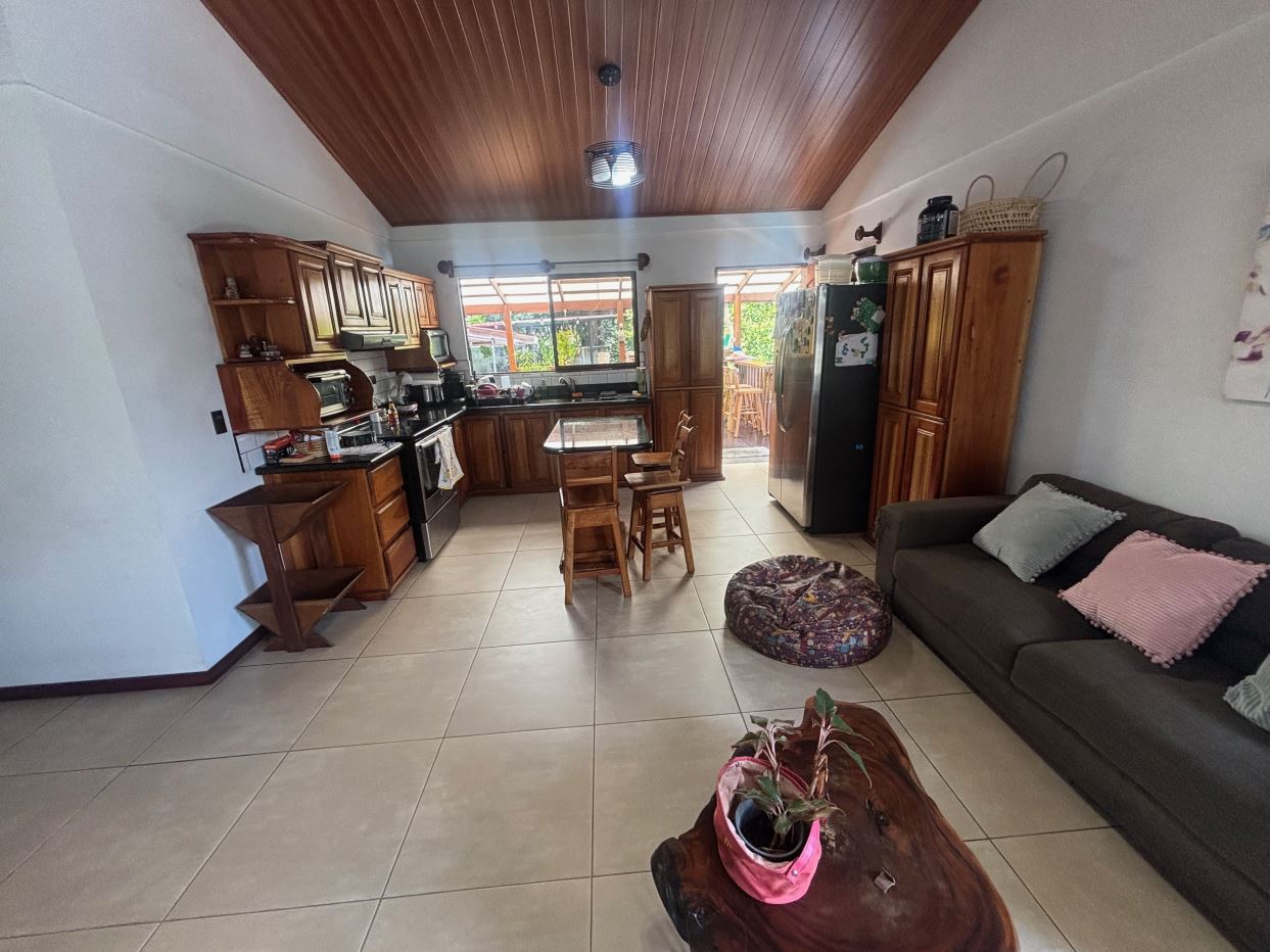 A cozy Atenas home with pool and rancho conveniently located close to everything.  This nicely designed and finished ranch style home is located just 1 minute from the east-west 27 highway and 3 minutes from Atenas Center but lies on a quiet residencial street within a short walk of supermarkets and restaurants.  The front of the home is entered by an automatic gate with a private and secure perimeter throughout.  The long private entrance leads to a carport and formal entry into the common area living room, kitchen and to the three bedrooms and one bath.  The kitchen leads way to a beautiful artesenal covered porch area adjacent to the long inviting pool and deck area.  The nicely landscaped backyard has a nice size orchard with plenty of citrus plants and other fruit trees.  There is an added annex room ideal for a separate apartment with bathroom or home office.  Farther in the back of the home is a covered bbq location.  There is an added storage area.