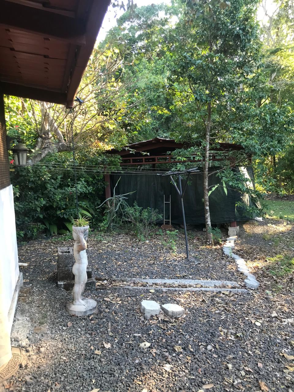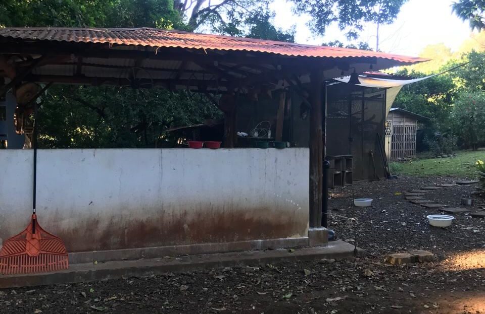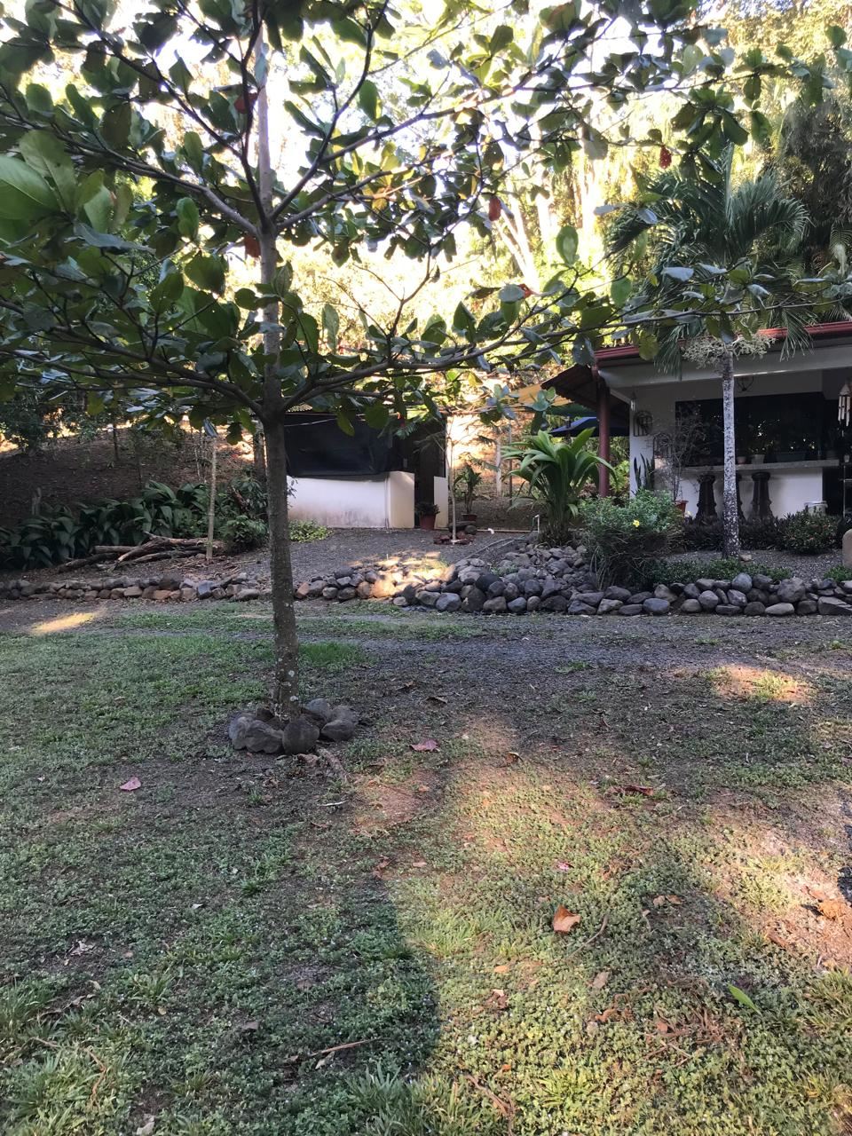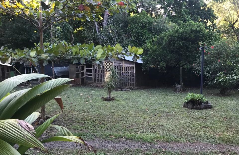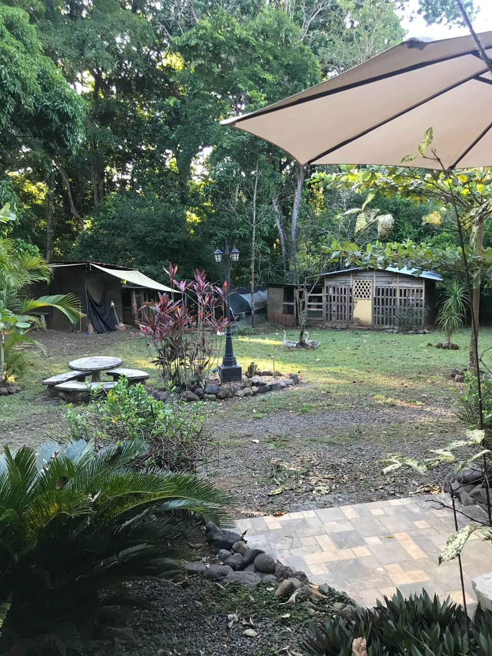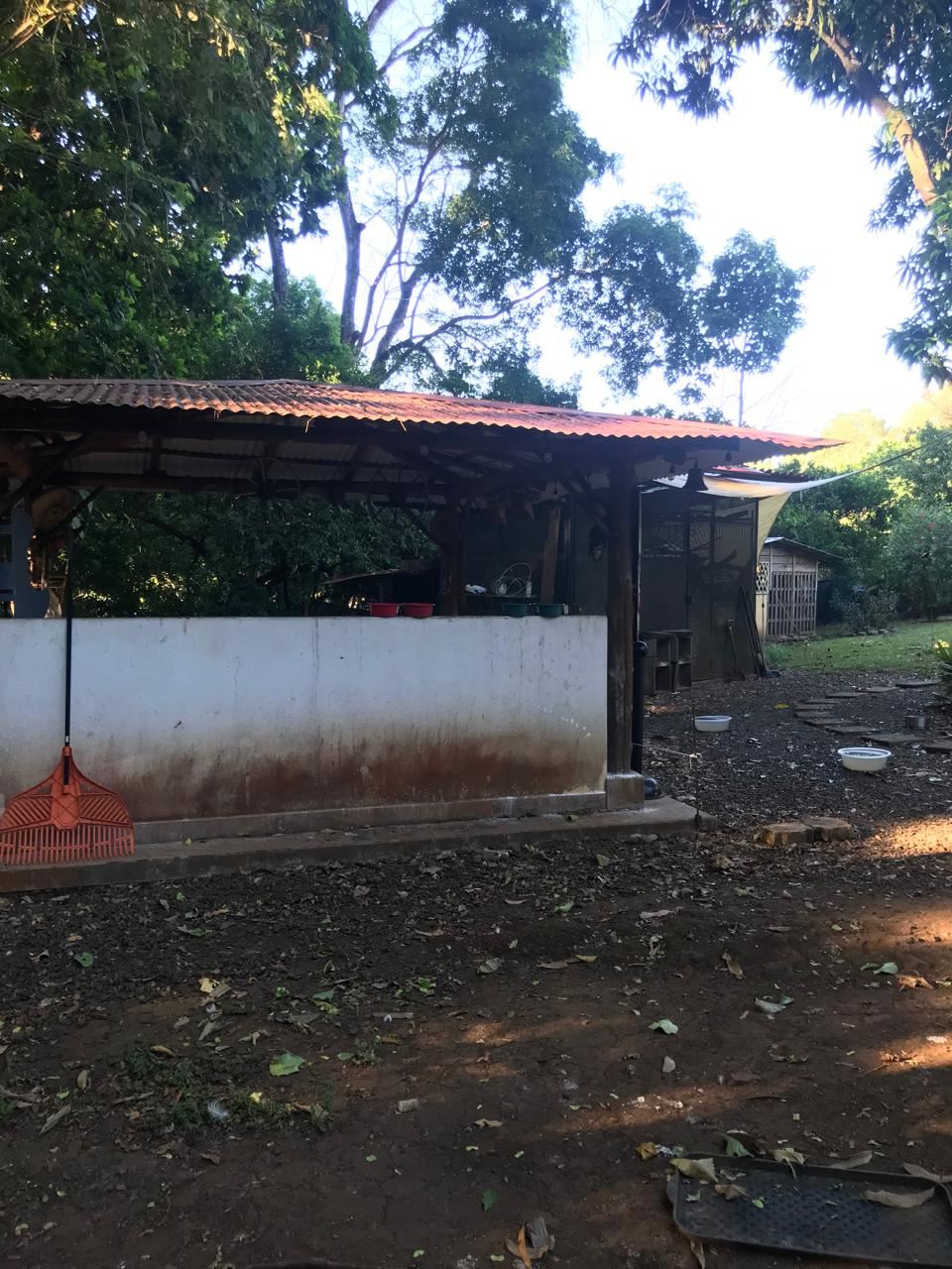 Countryside home in a farm setting next to primary forest with stream composed of 2 parcels, 3037 square meters, includes a house with 2 bedrooms, living room, kitchen, 2 full bathrooms, large hallway, laundry room, storage areas, garages for 6 cars, rancho bbq, pond, chicken coops, cages, green area, gardens, fruit and ornamental trees. There is a perimeter fence, security cameras.