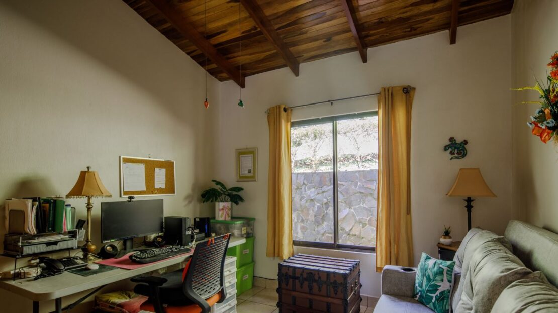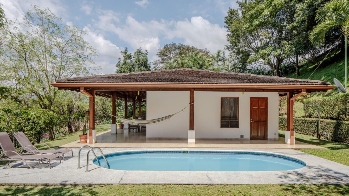 Entering the top main larger home’s lot features an ample lot that leads way to the inviting long lap and watersport’s made pool and wrap around porch ideal for a crowd and for entertaining and enjoying Atenas’ renown best climate. Leaving the wonderous panoramic views of this main home one enters the 300m2 interrior which has a feel of spaciousness with tall ceilings in the main living, dining and kitchen with plenty of light throughout. There is fine artesenal woodwork throughout the home including the slatted ceilings, in the very ample kitchen an the home’s door work. The main common living room leads to a nice sized master bedroom and bathrooms suite and to the other two bedrooms and two baths. Outside there’s a half bathroom for the pool use and an outside laundry area. Behing the home is an independent tool shed. This home has dedicated solar heating for the pool. The home is designed to be able to support and added second level construction. This top is sold non-furnished.