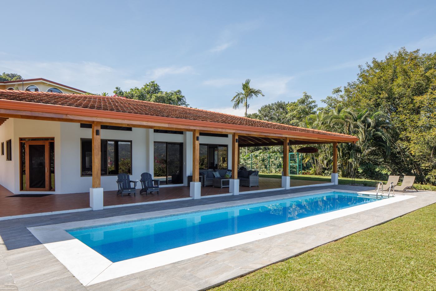 Drving past the smallest home leads way to a private driveway for the larger third 200m2 home that also features its own swimming pool and deck area. This home is also surrounded by beautiful manicured gardens and features its own large wrap around porch also ideal for enjoying the outside living. Inside is an ample common area with a spacious living room, dining room and a kitchen with nice woodworked cabinets throughout. This home is sold with appliances and semi-furnished.