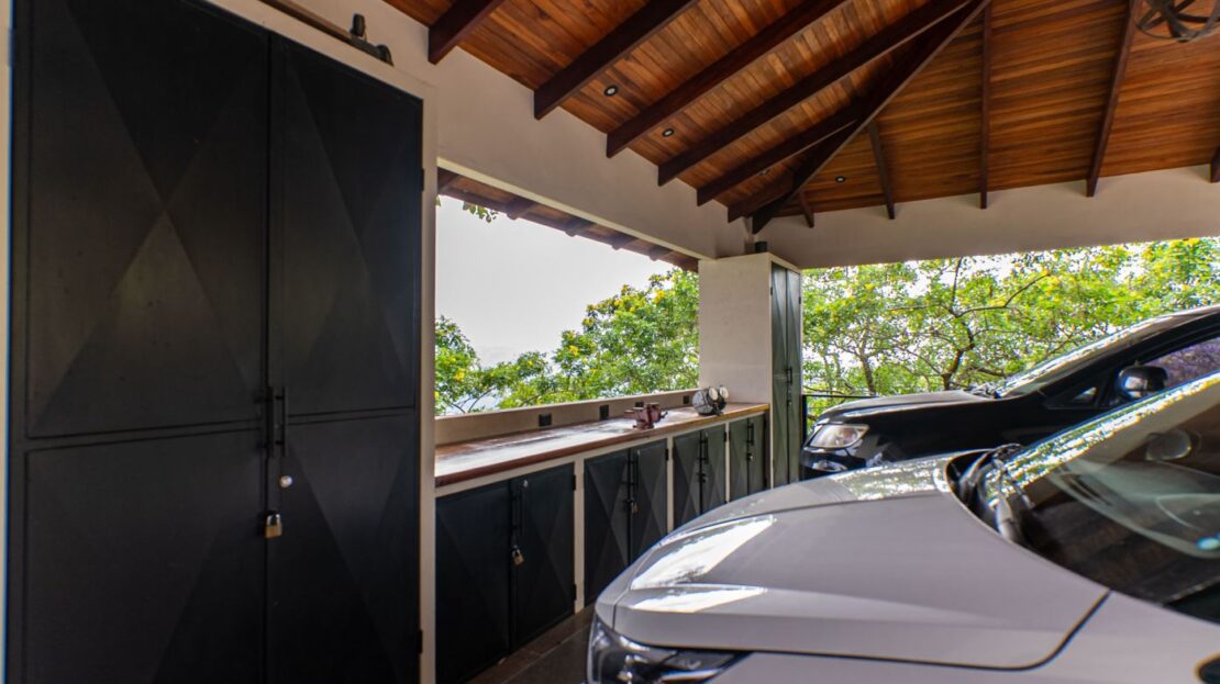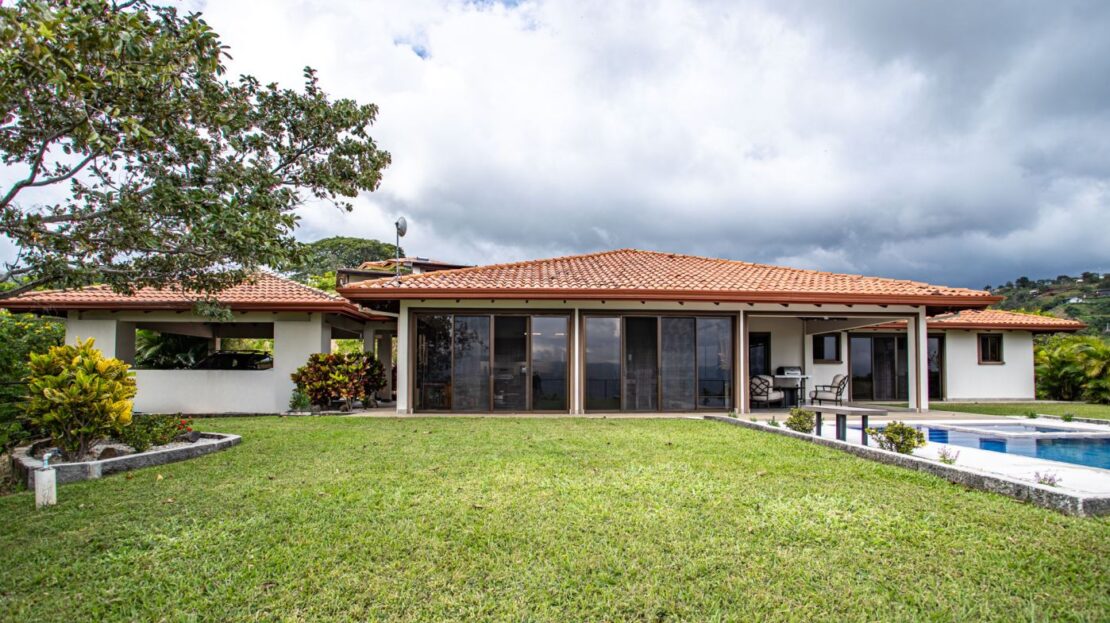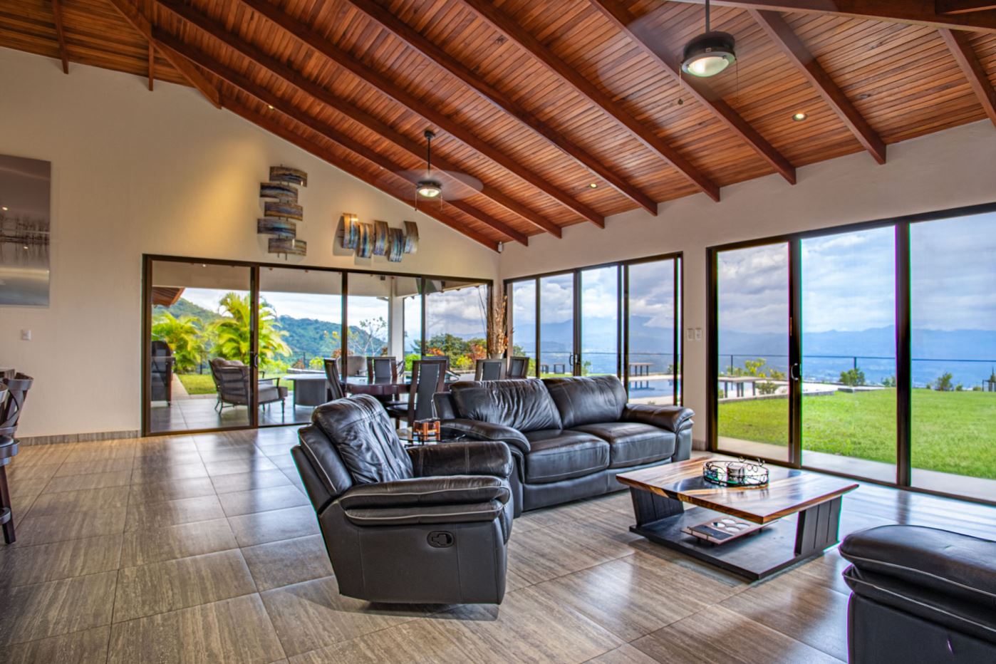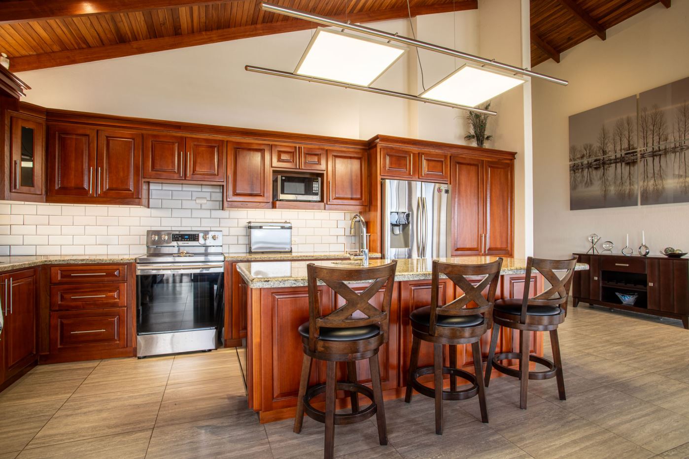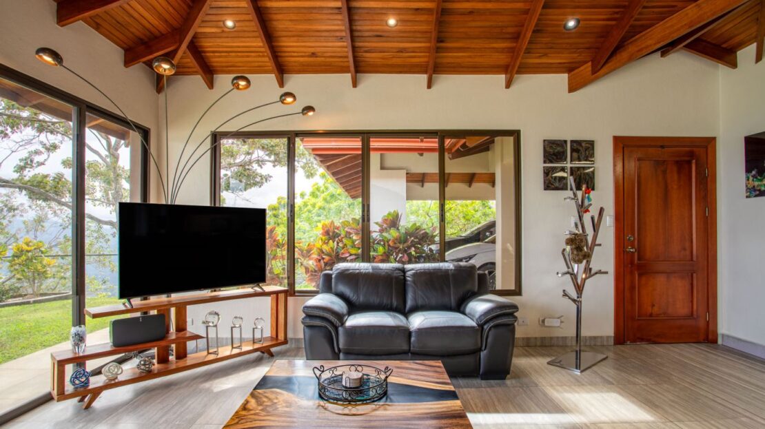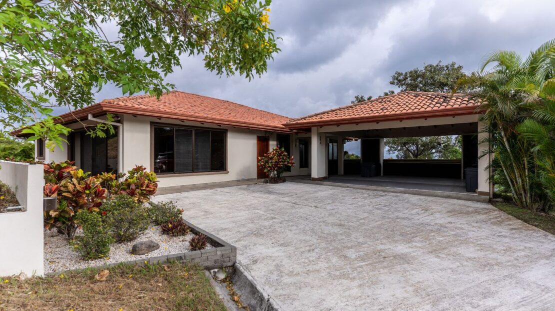 Mediterranean-style home with eclectic modern finishes in Hacienda Atenas with one of the best views on this side of town. This very well kept home sits just 8 minutes from town center and features amazing views of the Atenas countryside with the home facing south towards Puriscal and has almost a 300 degree view that includes some views of the Pacific Ocean and a good portion of the capital San Jose. The long private driveway leads two a 2-car carport with plenty of storage and electrical infrastructure for a home workshop. The formal entry leads to a large living-dining room area that nicely displays the woodwork to be found throughout the home including the inside and outside wood slatted ceiling, the woodwork thoughout the ample kitchen and bathrooms and the bedroom furniture. The kitchen has great lighting throughout ideal for a chef with an ultramodern centerpiece over the large kitchen island.