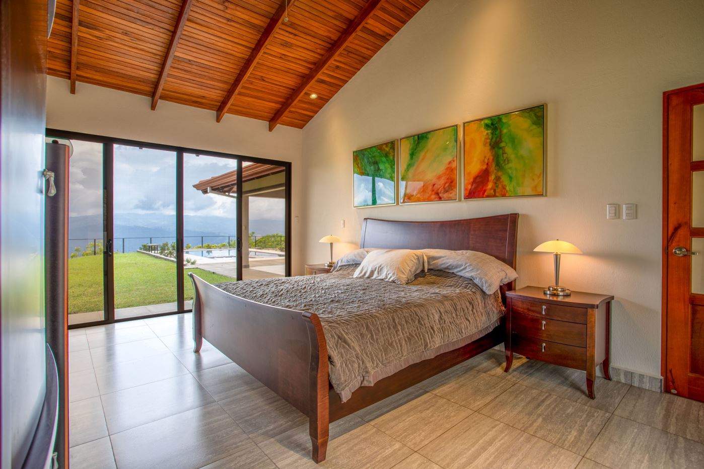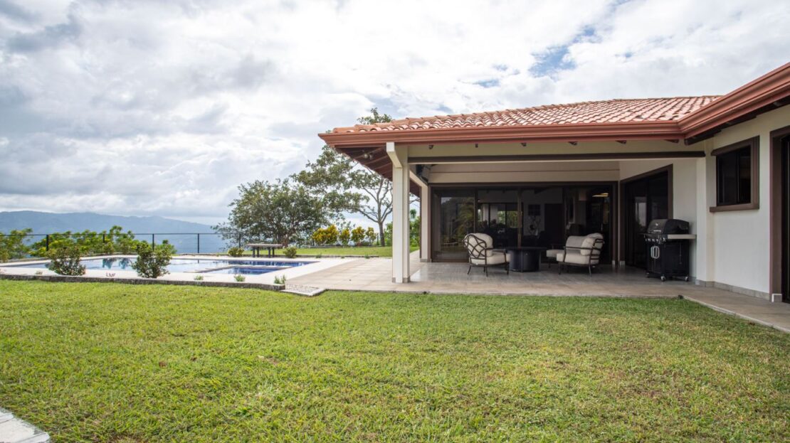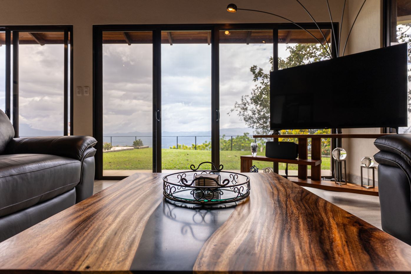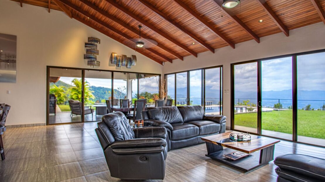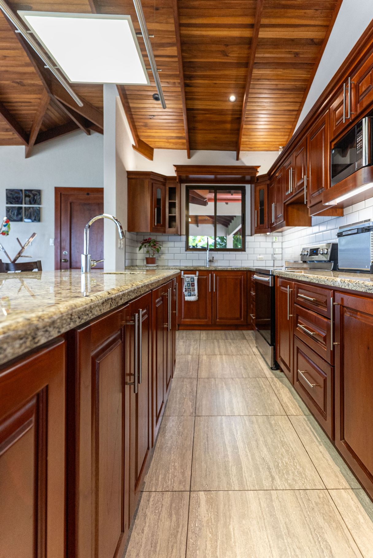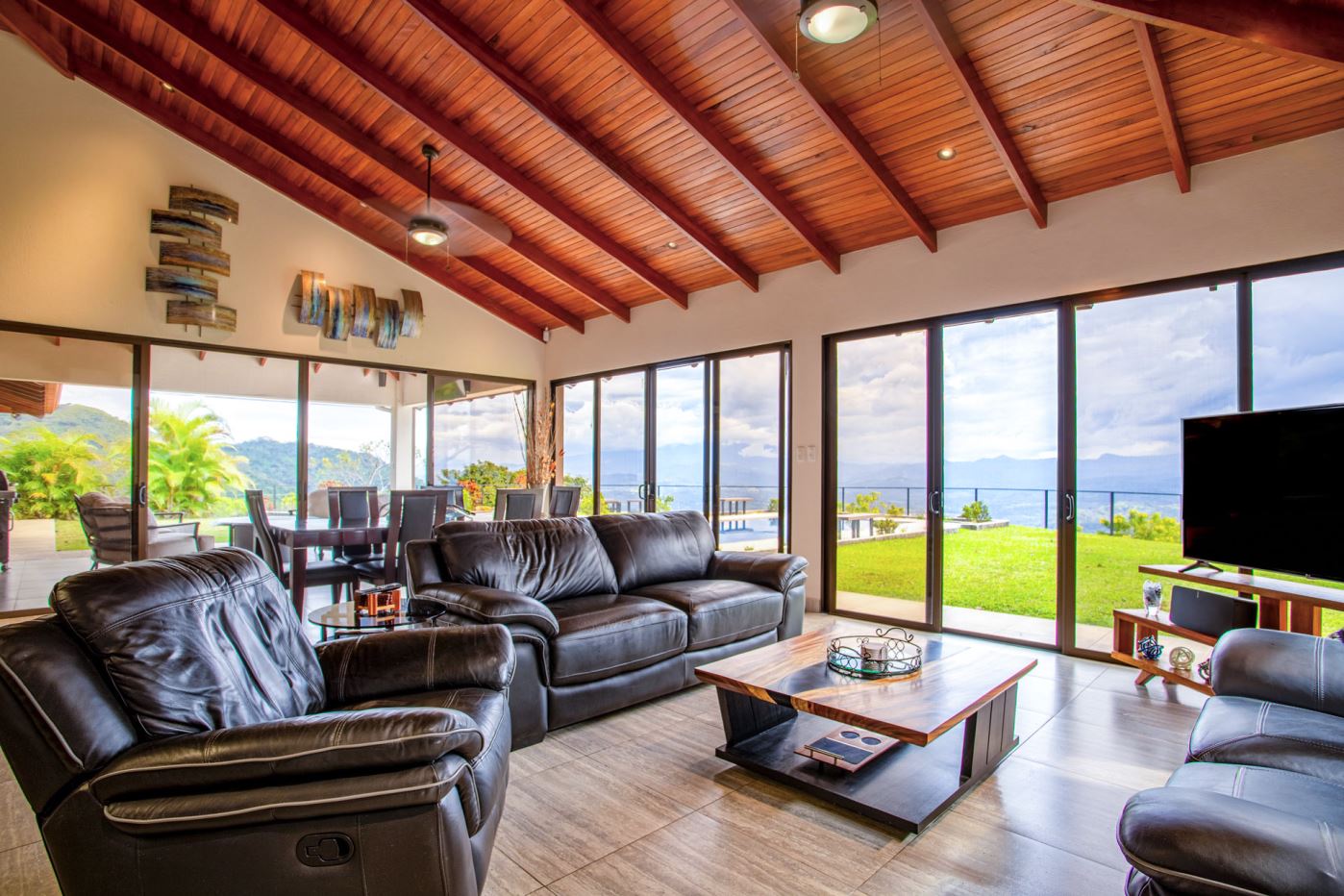 Mediterranean-style home with eclectic modern finishes in Hacienda Atenas with one of the best views on this side of town. This very well kept home sits just 8 minutes from town center and features amazing views of the Atenas countryside with the home facing south towards Puriscal and has almost a 300 degree view that includes some views of the Pacific Ocean and a good portion of the capital San Jose. The long private driveway leads two a 2-car carport with plenty of storage and electrical infrastructure for a home workshop. The formal entry leads to a large living-dining room area that nicely displays the woodwork to be found throughout the home including the inside and outside wood slatted ceiling, the woodwork thoughout the ample kitchen and bathrooms and the bedroom furniture. The kitchen has great lighting throughout ideal for a chef with an ultramodern centerpiece over the large kitchen island.