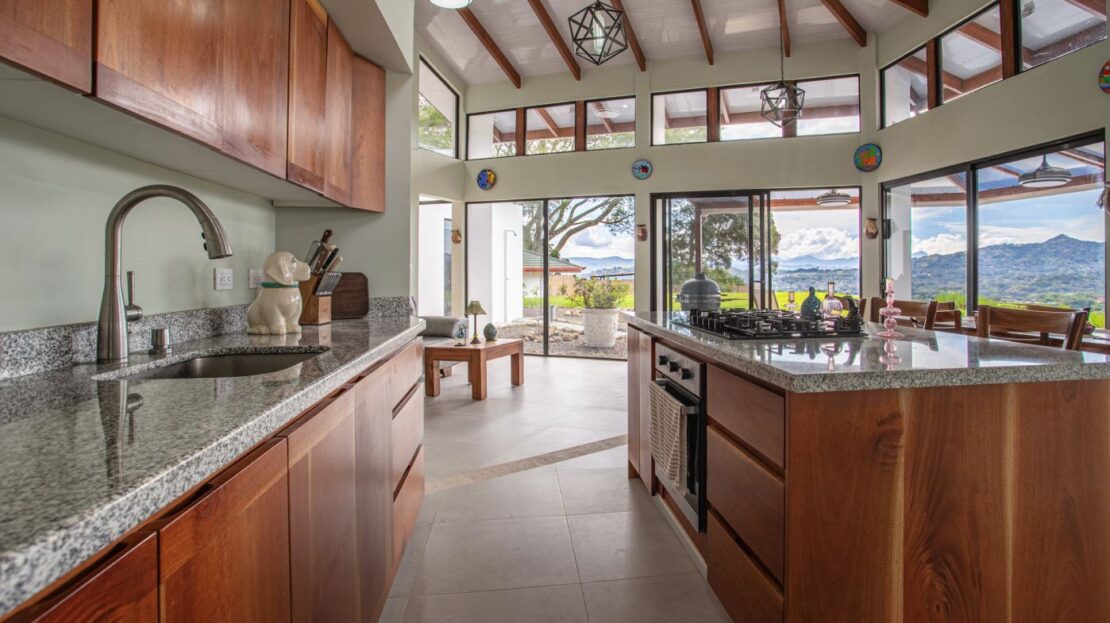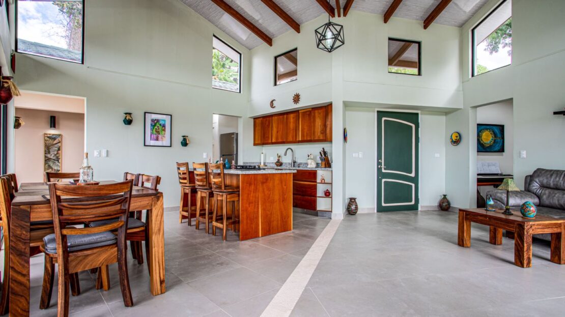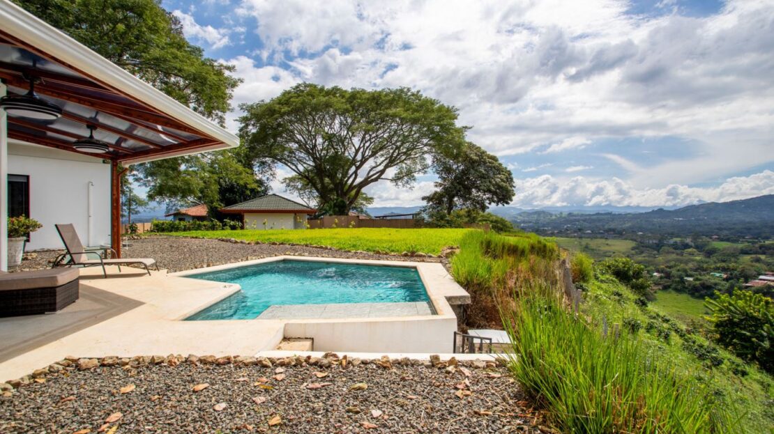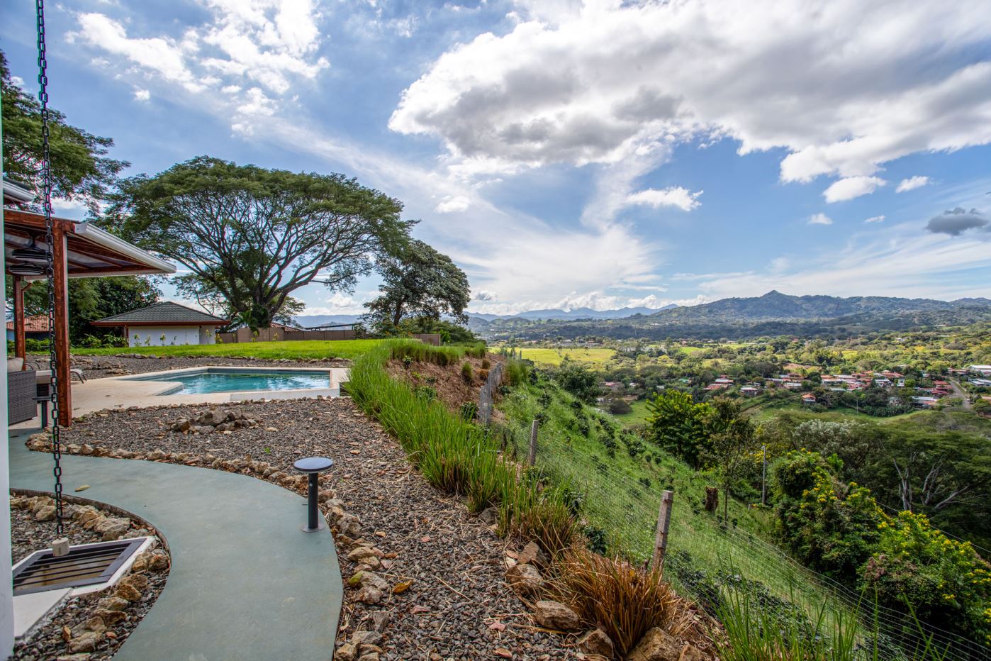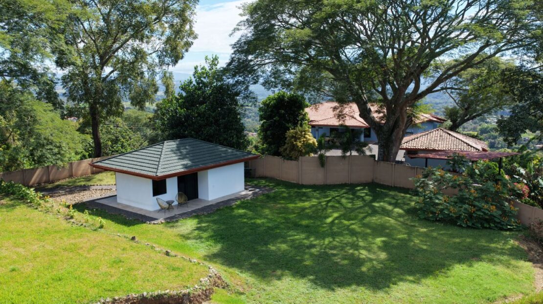 Modern designs can be found in this gated community in a natural setting in the Atenas countryside. This home is located in the private community of Cerro Luna in Barrio San Jose, about 12 minutes from town center. The property features 300 degree views towards the capital of San Jose, the area mountains and a good part of the small town of Atenas. The home’s layout features a common social open floor plan living and dinig room adjacent to a modern kitchen with artesenal woodwork throughout. This area leads to the inviting covered porch area and swimming pool. The master bedroom with ensuite bathroom can be found on one end of the home and two guest bedrooms on the opposite end with guest bathroom. The property is surrounded by nicely landscapped gardens and one also can find an independent guest studio on the opposite end of the lot with a kithen-dining area and full bathroom.
