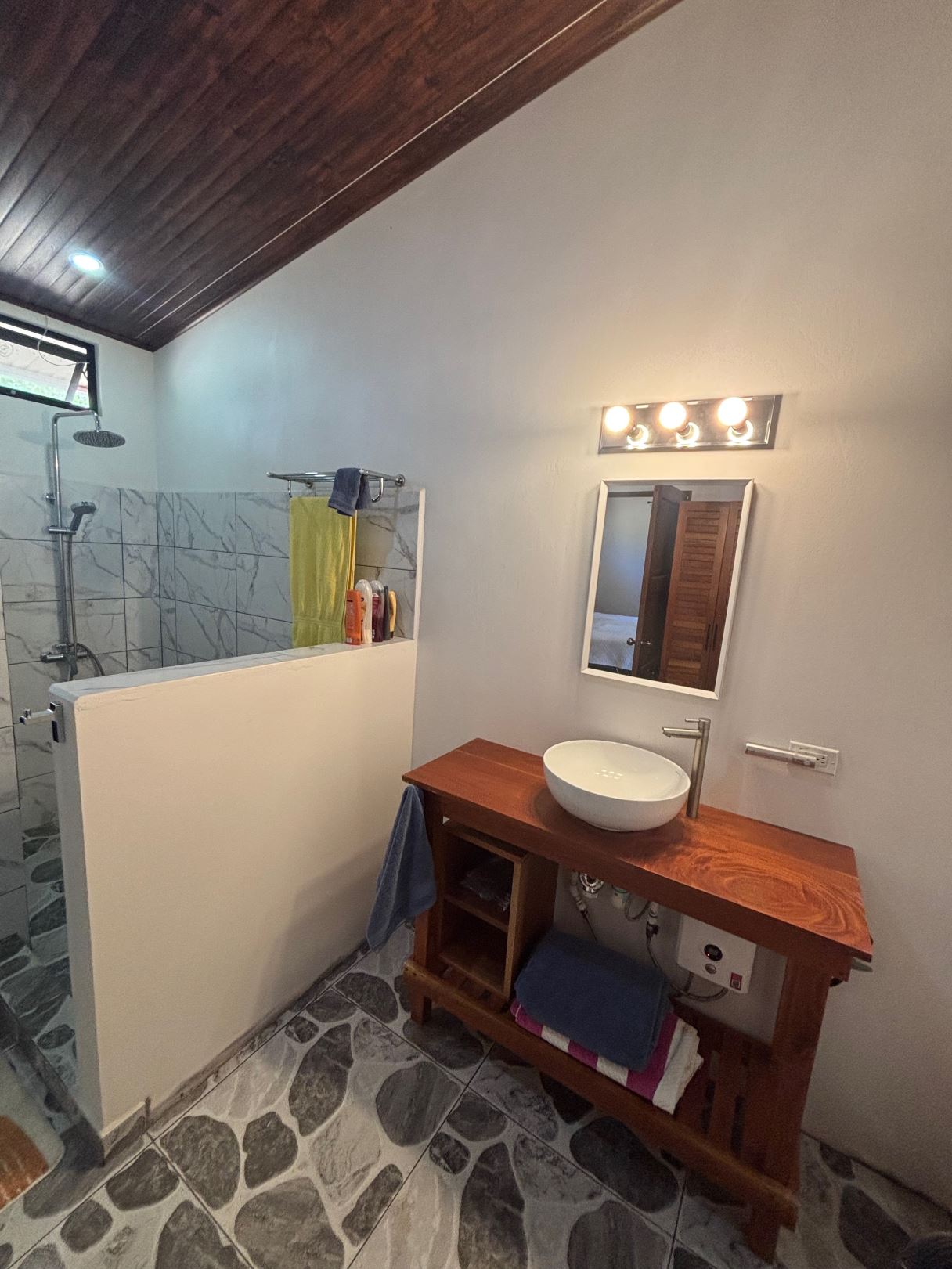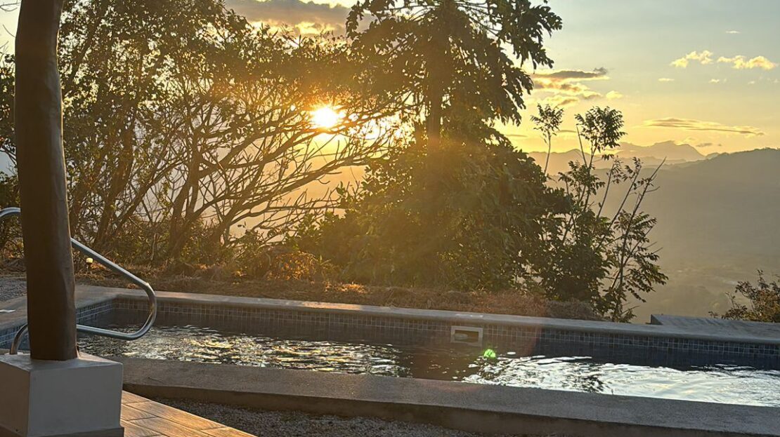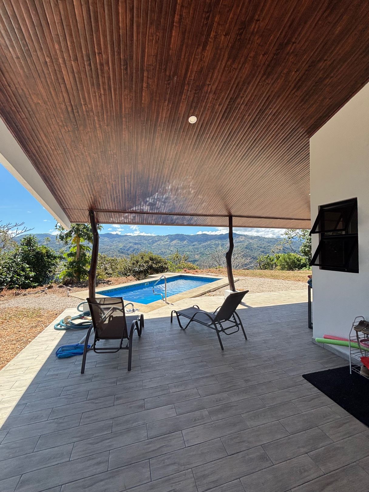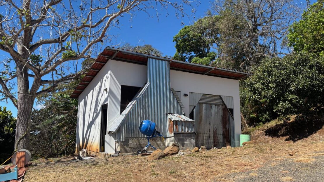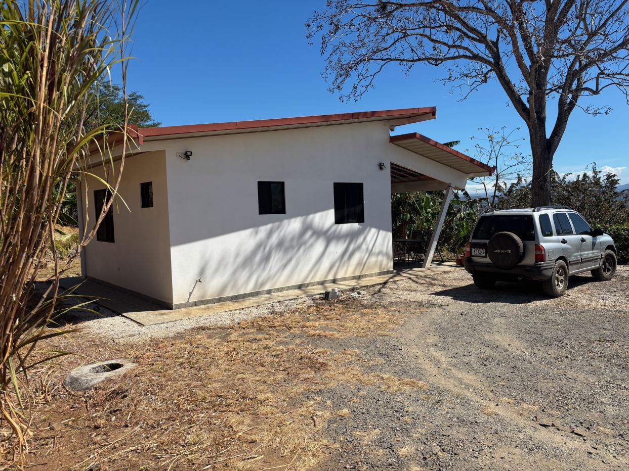 Unique style home and guest home with big views in gated countryside Atenas community is located less than 15 minutes from Atenas Center in a community the offers fiber optic, a great water source, gated control entrance and paver-brick road to the property. The amazing views from this property streatch for east to west so seeing sun ups to sun downs are possible, from the city to the Pacific Ocean with big southernly views of nature. The long private etrance to the property leads to a large 50m2 storage area and to the main home that is composed of 2 master en sute bedrooms with bath and to a 1 bedroom guest home. The main home has an extra large porch extending from one end of the home to the other ideal for outside living. The big open kitchen. dining and living areas offer direct access to the two bedrooms. The sliding glass doors in the living room lead to the inviting covered porch, salt water pool and deck area. Adjacent are several mango trees along with an orchard made up of magos, oranges, limes, coconut, bananas, plaintain, water apple, papaya, guava, avocado, other types of citrus and dragonfruit. There is flora and fuana of all types in the area including all types of birds including tucans and falcos as well as monkies. Additionally the main home features a separate laundy and half bathroom area as well as a large storage area with attached wood buring oven.