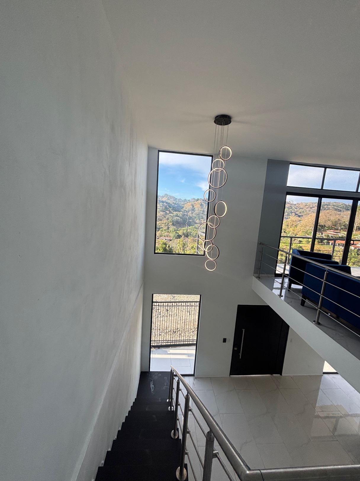 Ultramodern home with big Central Valley views is located just 10 minutes from town center in the tranquil counstryside between Morazan and San Isidro. The cooler temperatures and ever changing panoramic views is the perfect location to experience the cooler Atenas climates. The home has a perimeter with a long entry for several cars and the formal entrance to an open concept room with a guest bedroom and separate bath below and a large bedroom with en suite bath. There are top quality finishes and fictures found around the home. The modern-style kitchen has a large central island ideal for entertaining making the kitchen the center of the home. A staircase leads to an extra large master bedroom and en suite bath area with a sitting room and balcony with ever bigger views. The home is being sold semi-furnished with designer furniture and state of the art appliances.