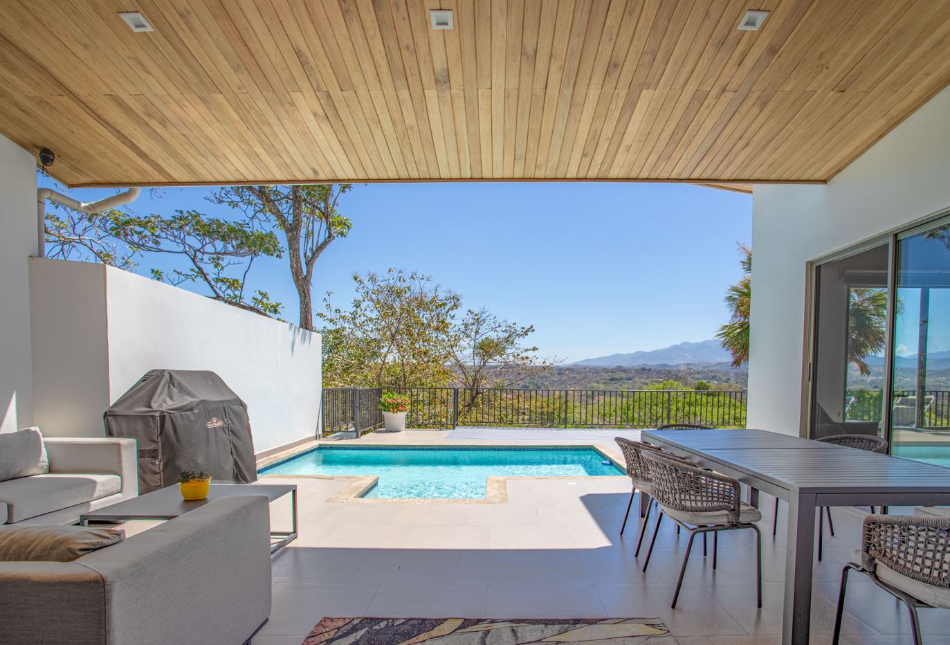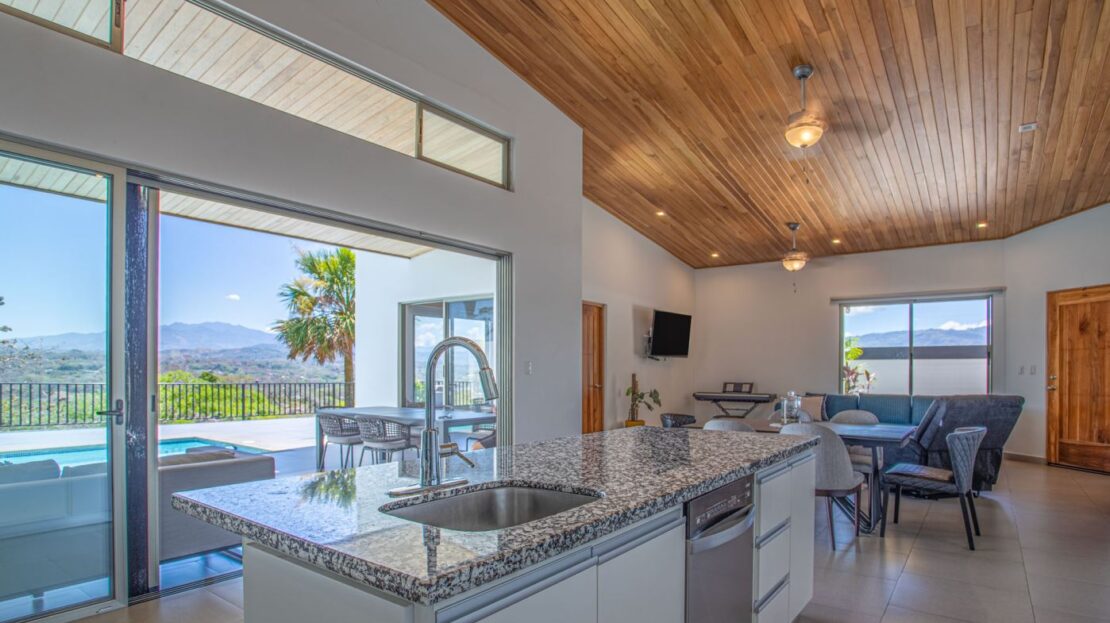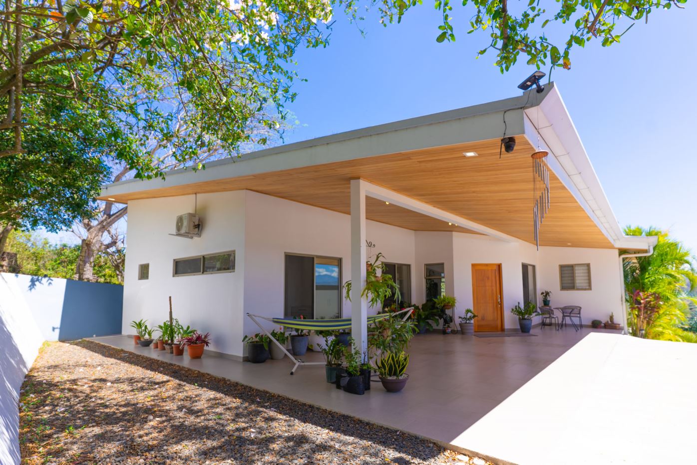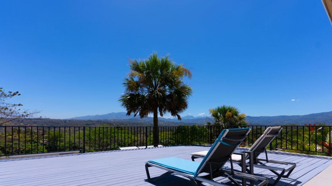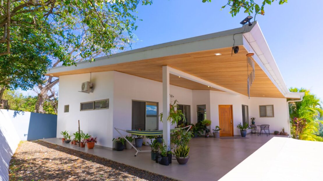 This modern-style home is located in a small four home gated community which is conveniently located to town Center and the old road and new highway going east-west.  This very well kept home is located on a small hill that overlooks the Central Valley mountains and the surrounding nature.  The home is serviced by two controlled gates with a long private driveway with plenty of front yard ideal for a large orchard or future construction with almost 1/4 acre (998m2 of land).  The formal entry leads to a lovely decorated living and dinig room that leads way to a large modern-style kitchen with a large sliding glass door that leads to the added outside living and eating areas ideal for outside living.  The extra large deck is ideal for entertaining a crowd.  The nicely wooden artesenal ceilings ties together with the modern finishes.  On one end is a master bedroom with en suite bathroom and walk in closet.  The other side of the home leads to an inside laundy area with a guest bathroom and guest bedroom and a second guest bedroom suite with bathroom.  The home’s furnishings can be negotiated separately.