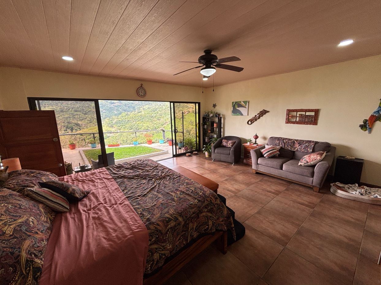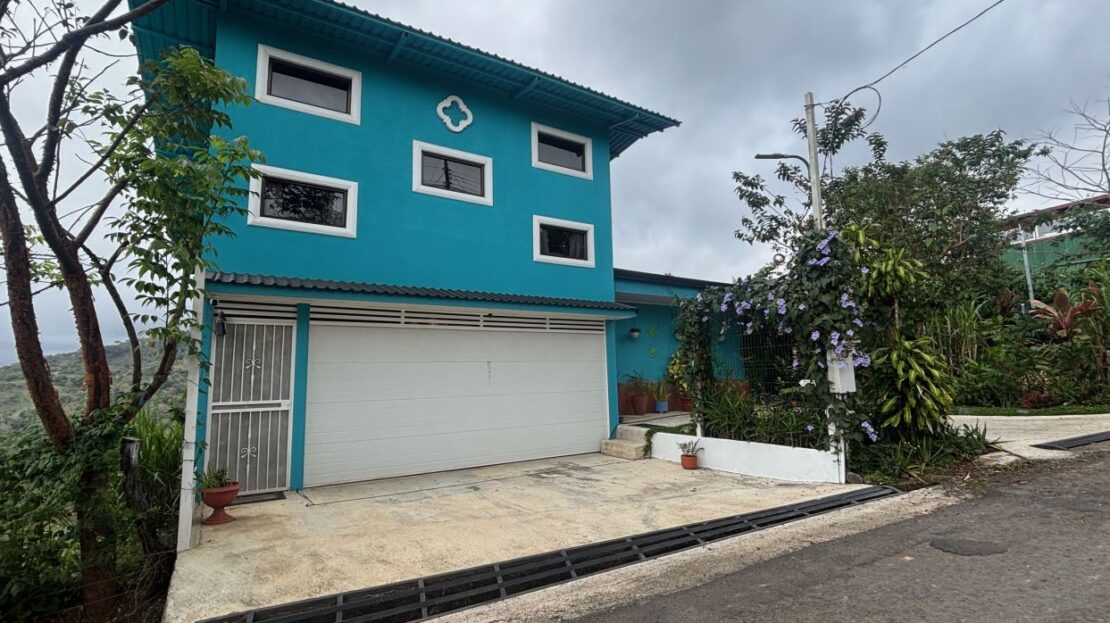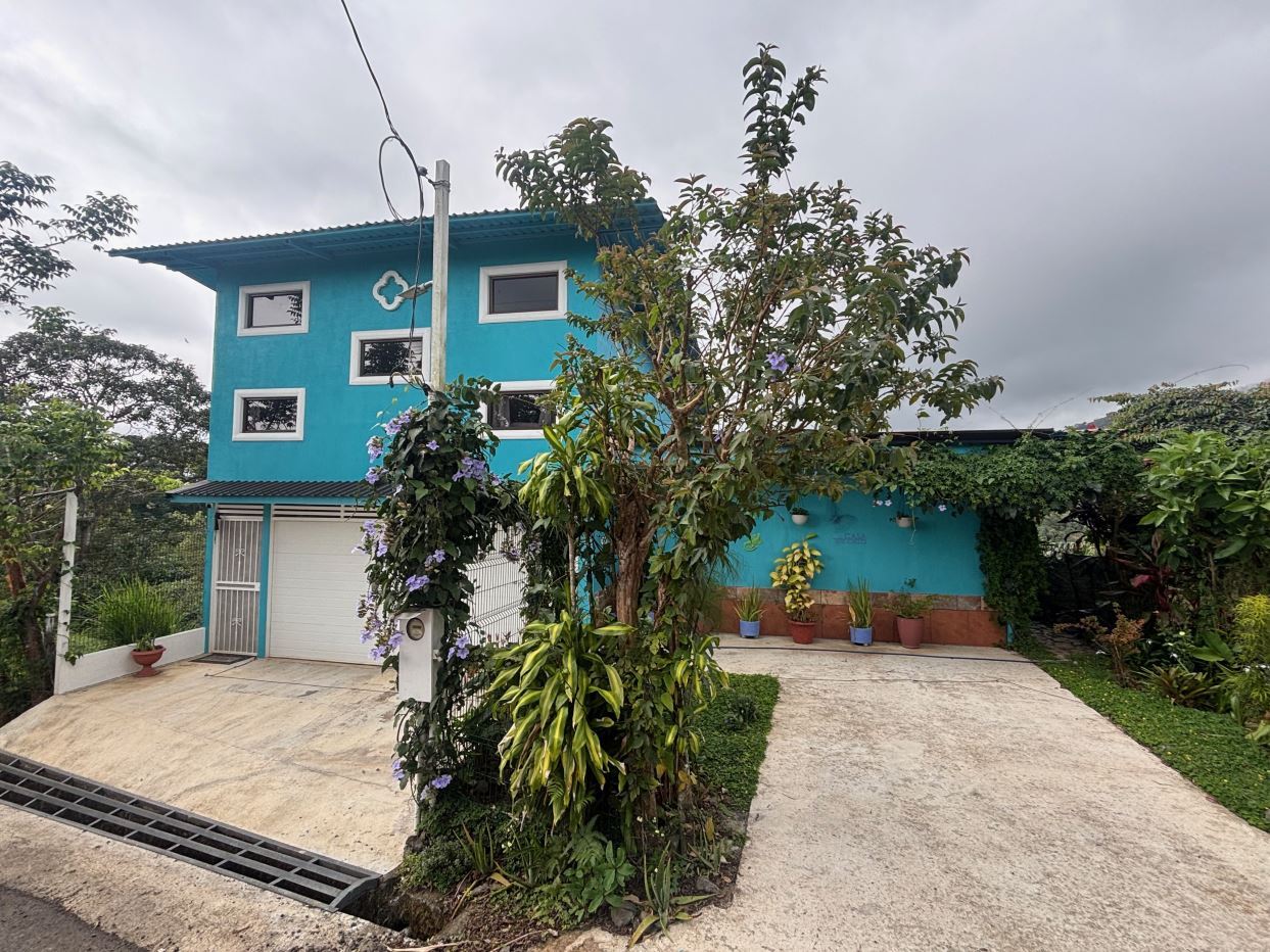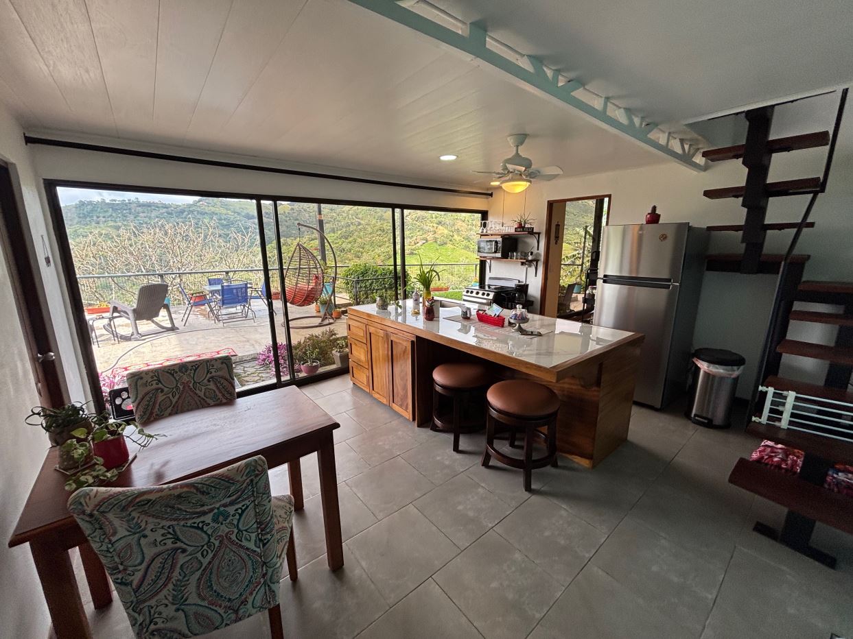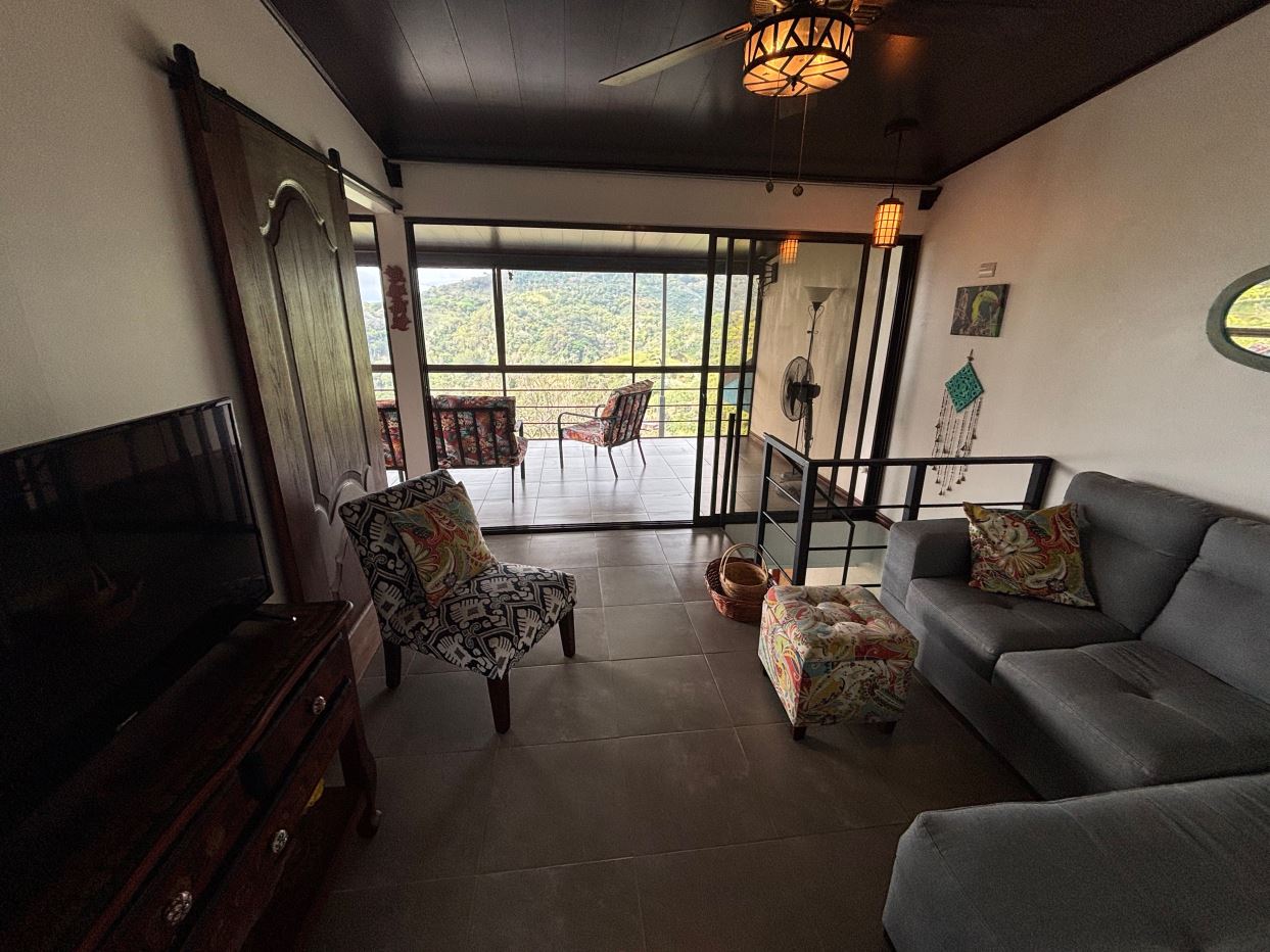 This unique style home is located in a quaint small neighborhood with big Pacific Ocean views and only 20 minutes from Atenas Center. Entering into the home one finds the living, kitchen and dinig area that leads to a downstairs main bedroom suite with on suite bathroom and small walk in closet. Adjacent to the kitchen is a half guest bath and a separate laundry area. Both of these areas feature access through the sliding glass doors to a large covered patio area with great views of the area mountains. Stairs lead downstairs to a bottom level covered deck that can serve for added storage or can be outfitted to serve as another area. Inside stairs lead to an upstairs added 3 bedrooms and 1 baths as well as an upper level screened in porch and inside living room. There is a 2-car garage and plenty of added room for added parking outside. All the furniture and appliances can be included in the negotiated price.