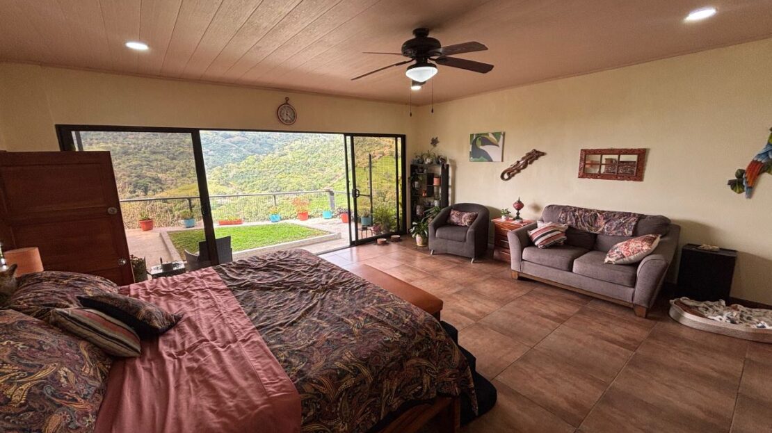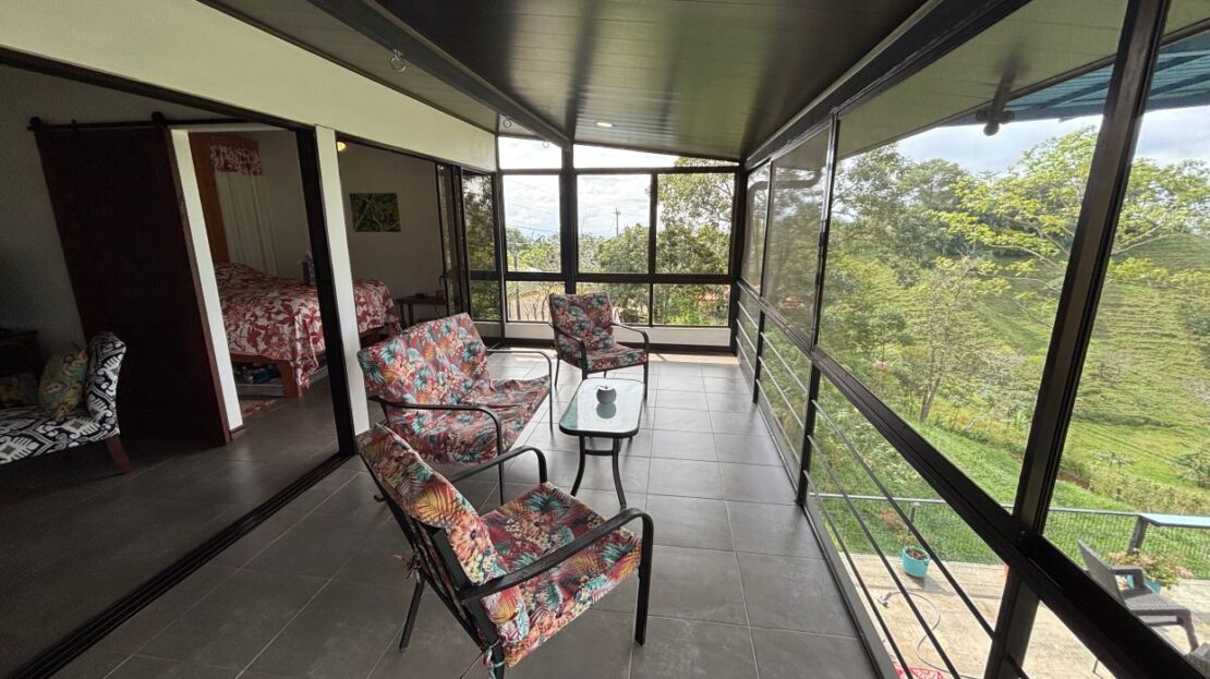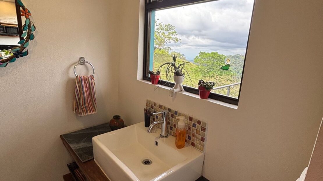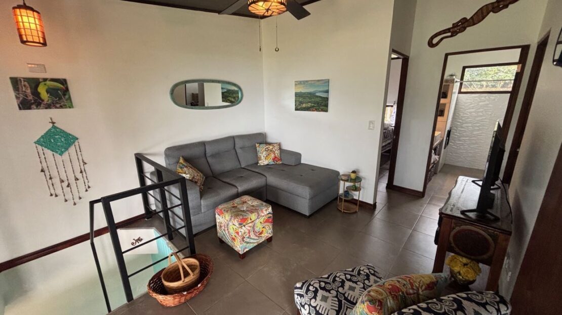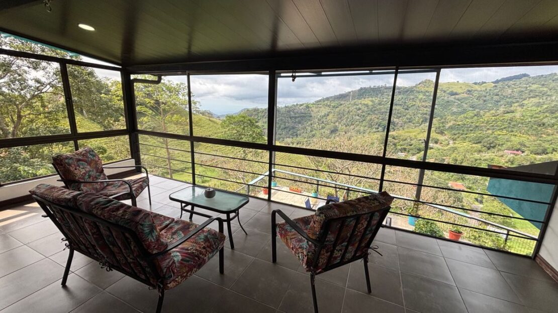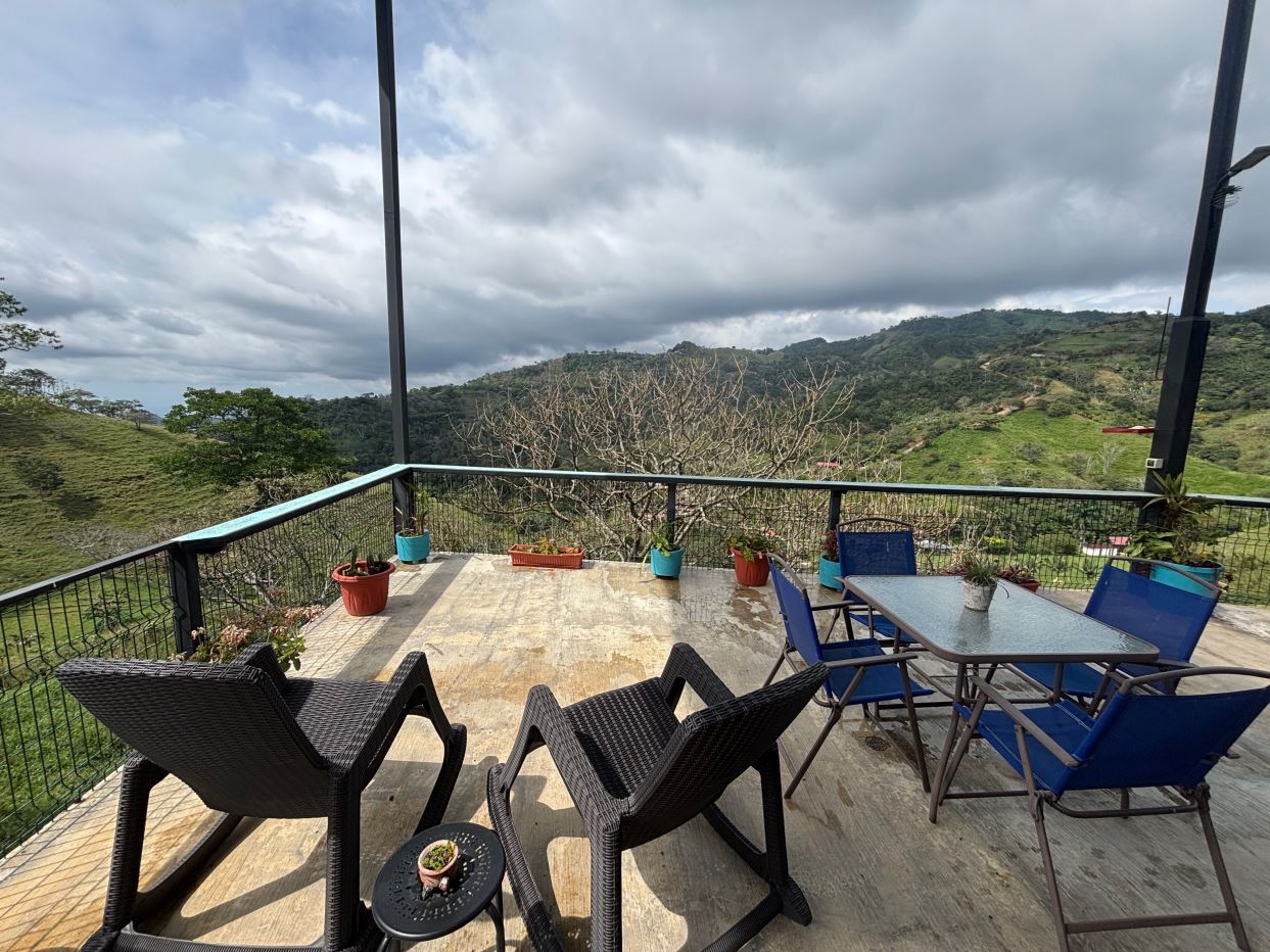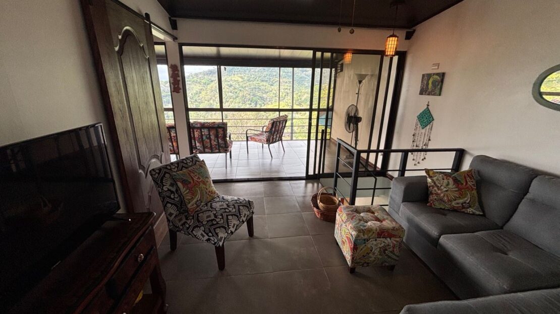 This unique style home is located in a quaint small neighborhood with big Pacific Ocean views and only 20 minutes from Atenas Center. Entering into the home one finds the living, kitchen and dinig area that leads to a downstairs main bedroom suite with on suite bathroom and small walk in closet. Adjacent to the kitchen is a half guest bath and a separate laundry area. Both of these areas feature access through the sliding glass doors to a large covered patio area with great views of the area mountains. Stairs lead downstairs to a bottom level covered deck that can serve for added storage or can be outfitted to serve as another area. Inside stairs lead to an upstairs added 3 bedrooms and 1 baths as well as an upper level screened in porch and inside living room. There is a 2-car garage and plenty of added room for added parking outside. All the furniture and appliances can be included in the negotiated price.