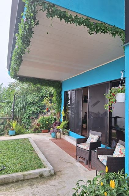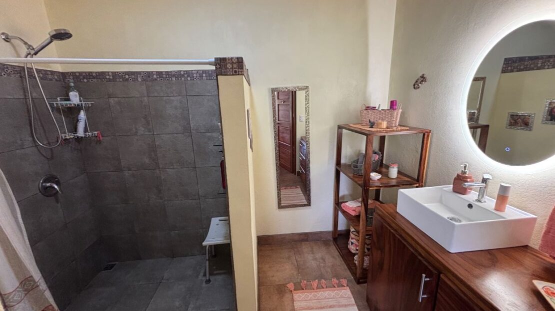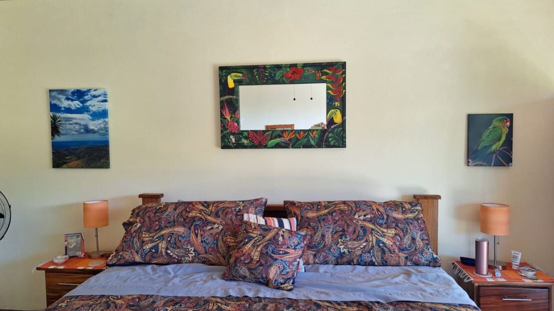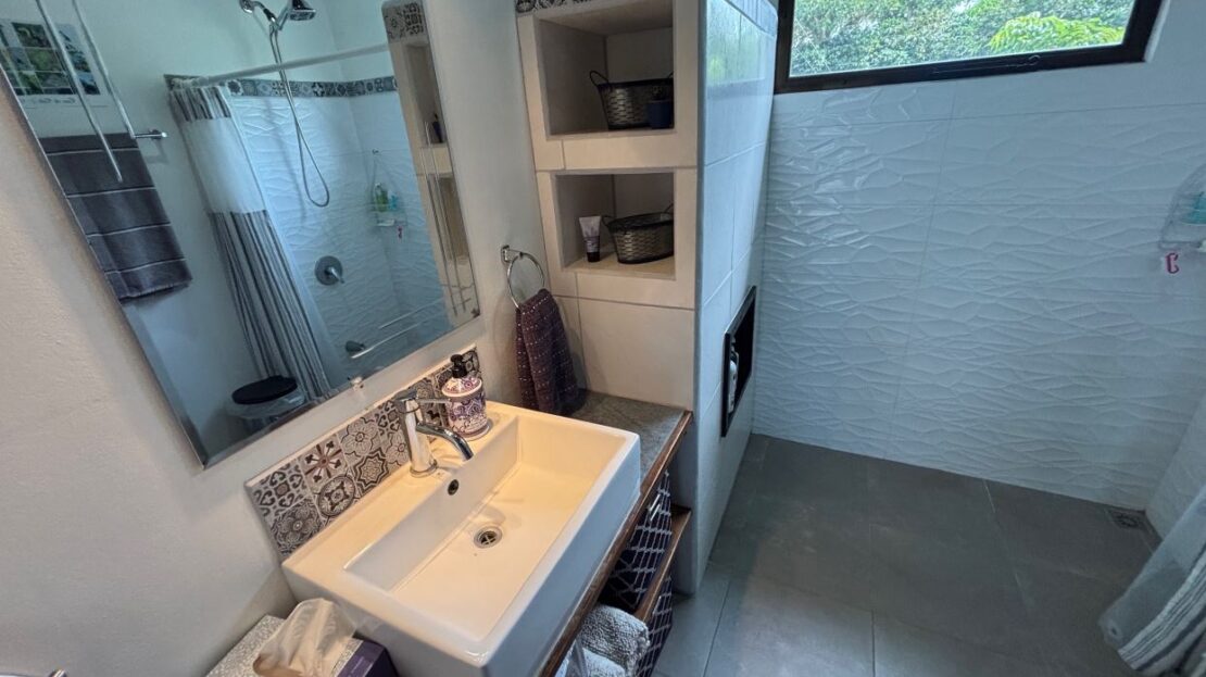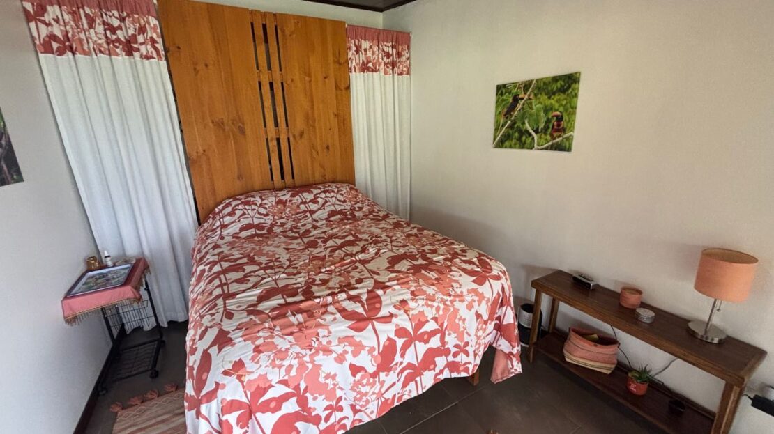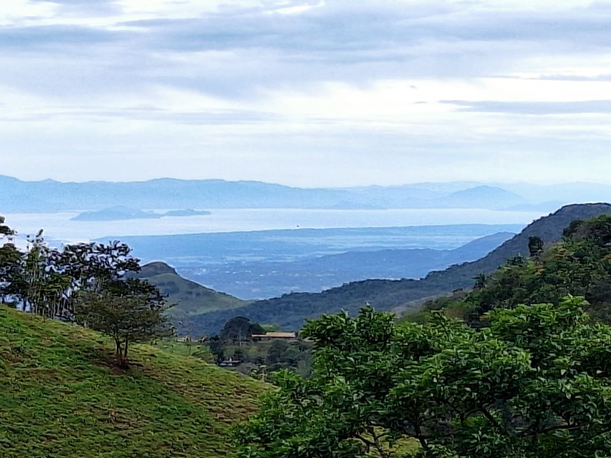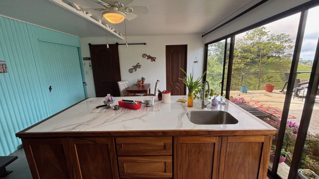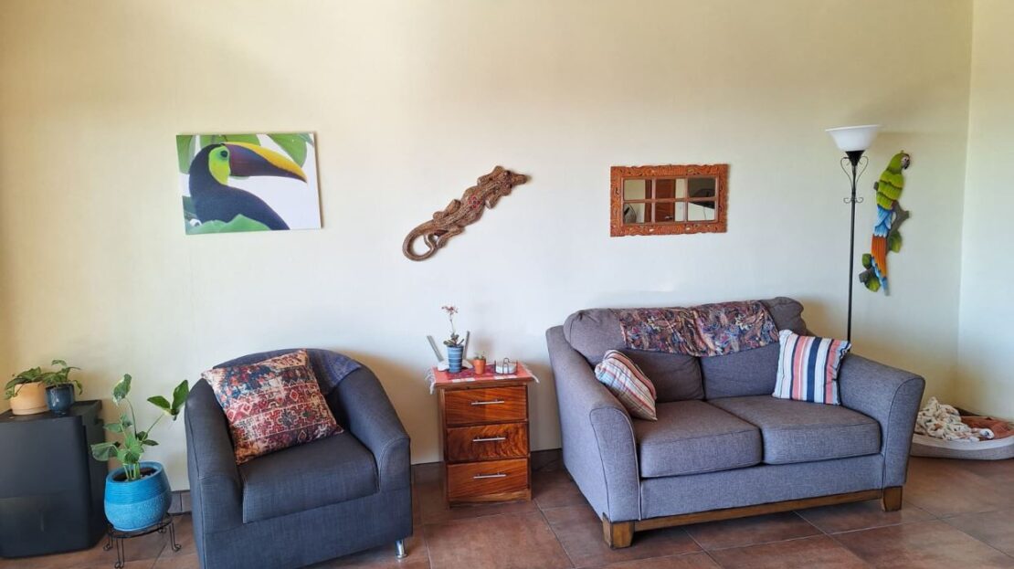 This unique style home is located in a quaint small neighborhood with big Pacific Ocean views and only 20 minutes from Atenas Center. Entering into the home one finds the living, kitchen and dinig area that leads to a downstairs main bedroom suite with on suite bathroom and small walk in closet. Adjacent to the kitchen is a half guest bath and a separate laundry area. Both of these areas feature access through the sliding glass doors to a large covered patio area with great views of the area mountains. Stairs lead downstairs to a bottom level covered deck that can serve for added storage or can be outfitted to serve as another area. Inside stairs lead to an upstairs added 3 bedrooms and 1 baths as well as an upper level screened in porch and inside living room. There is a 2-car garage and plenty of added room for added parking outside. All the furniture and appliances can be included in the negotiated price.